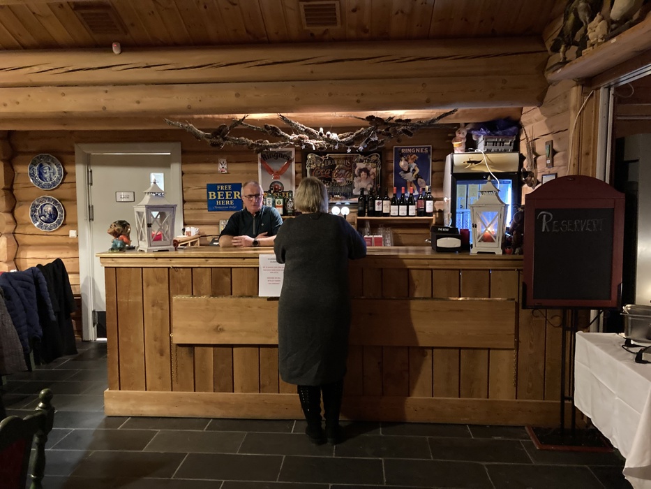 Men så til det mer hyggelige. Vi møtte opp i spisesalen og der fikk vi god og rikelig mat, både kald og varm mat servert på buffet. I baren kunne vi kjøpe den drikken som vi måtte ønske og stemningen ble god. Etter maten dukket det opp en trubadur med gitar og musikk-boks som underholdt til de sene nattetimer, og vi sang med etter beste evne. Vi opplevde kvelden som svært hyggelig.